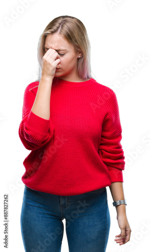 Young blonde woman wearing winter sweater over isolated background tired rubbing nose and eyes feeling fatigue and headache. Stress and frustration concept.