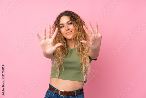 Young blonde woman with curly hair isolated on pink background counting nine with fingers