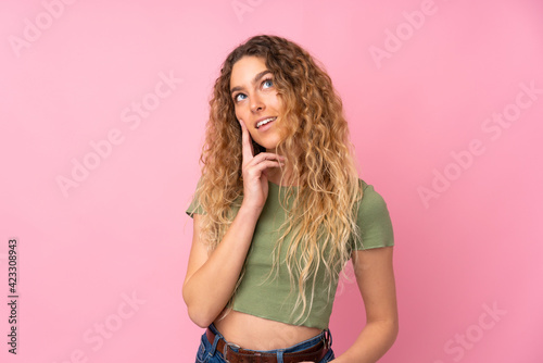Young blonde woman with curly hair isolated on pink background thinking an idea while looking up