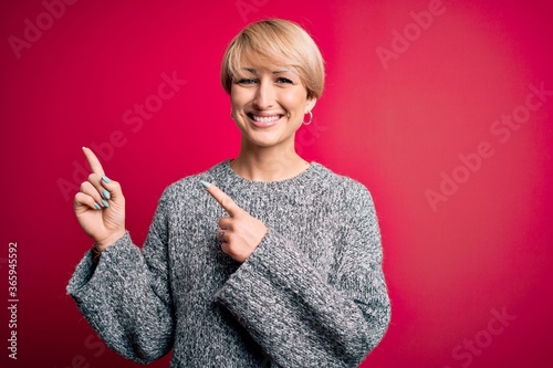 Young blonde woman with modern short hair wearing casual sweater over pink background smiling and looking at the camera pointing with two hands and fingers to the side.