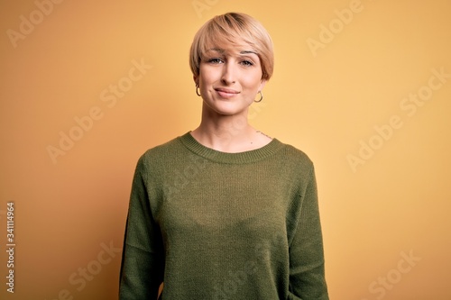 Young blonde woman with modern short hair wearing casual sweater over yellow background looking sleepy and tired, exhausted for fatigue and hangover, lazy eyes in the morning.