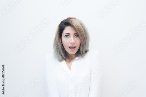 Young blue eyes blonde woman amazed expression