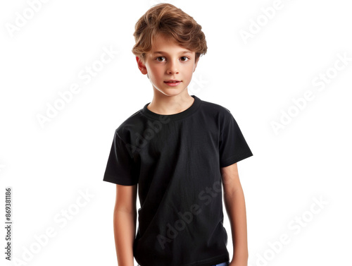 Young boy in black t-shirt mockup standing against white background. Perfect for fashion, youth and casual wear themes.
