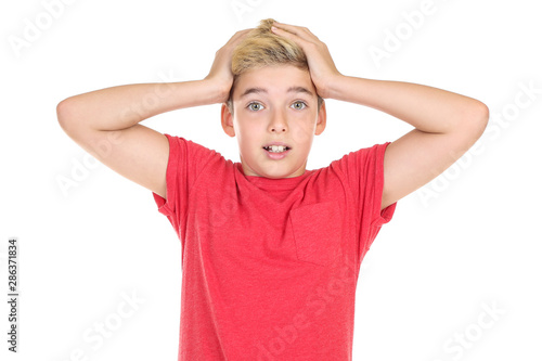 Young boy in red t-shirt on white background