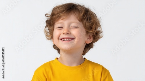 Young boy in yellow shirt laughing heartily, eyes closed, teeth visible, radiating pure childhood delight