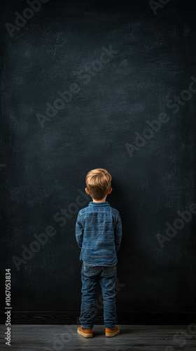 young boy stands in front of blank blackboard, wearing denim clothing and looking thoughtful. scene evokes sense of curiosity and anticipation