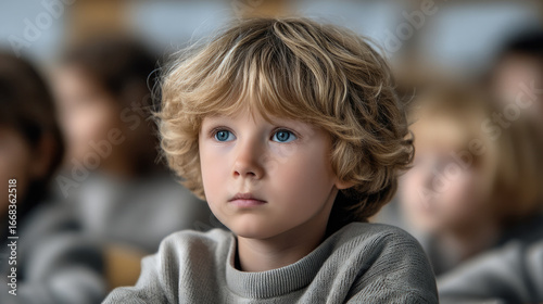 Young boy with curly blond hair and blue eyes sitting in classroom, looking thoughtful and slightly nervous, wearing gray sweater