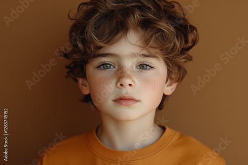 Young boy with curly hair and blue eyes posing against a warm background in a casual orange sweatshirt