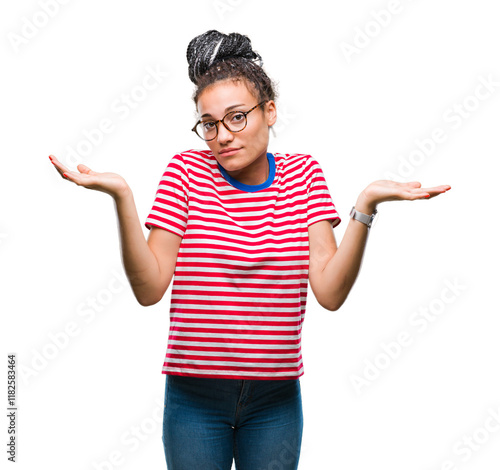 Young braided hair african american girl wearing glasses over isolated background clueless and confused expression with arms and hands raised. Doubt concept.