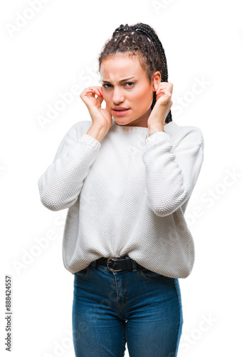 Young braided hair african american girl wearing winter sweater over isolated background covering ears with fingers with annoyed expression for the noise of loud music. Deaf concept.