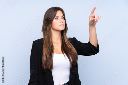 Young Brazilian business woman over isolated blue background touching on transparent screen