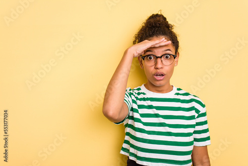 Young Brazilian curly hair cute woman isolated on yellow background looking far away keeping hand on forehead.