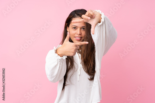 Young Brazilian girl over isolated pink background focusing face. Framing symbol