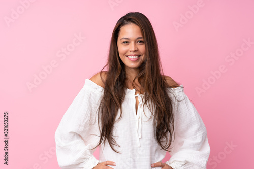 Young Brazilian girl over isolated pink background posing with arms at hip and smiling