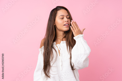 Young Brazilian girl over isolated pink background yawning and covering wide open mouth with hand