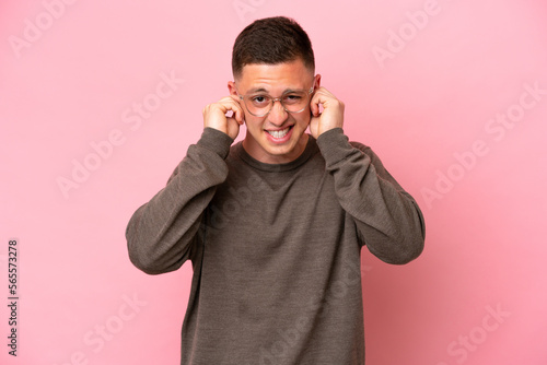 Young Brazilian man isolated on pink background frustrated and covering ears