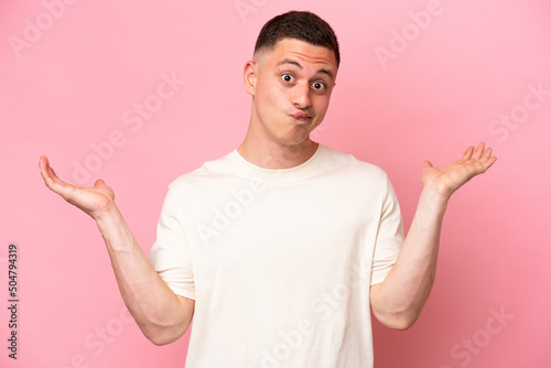 Young Brazilian man isolated on pink background having doubts while raising hands