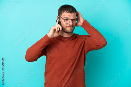 Young Brazilian man using mobile phone isolated on blue background having doubts