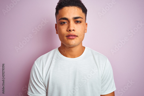 Young brazilian man wearing t-shirt standing over isolated pink background with a confident expression on smart face thinking serious