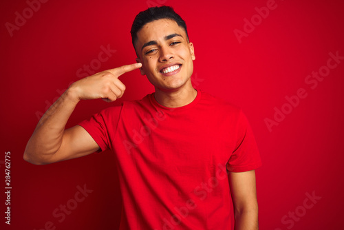 Young brazilian man wearing t-shirt standing over isolated red background Pointing with hand finger to face and nose, smiling cheerful. Beauty concept