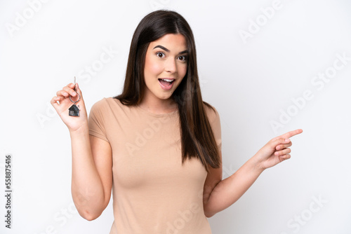 Young Brazilian woman holding home keys isolated on white background surprised and pointing finger to the side