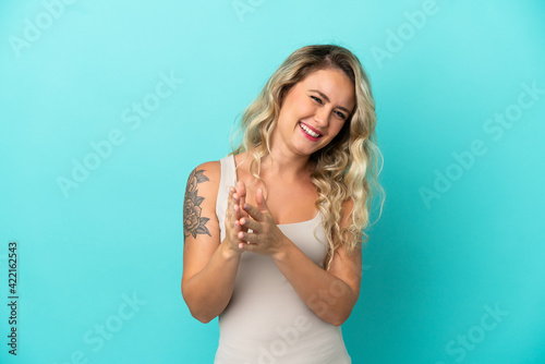 Young Brazilian woman isolated on blue background applauding after presentation in a conference
