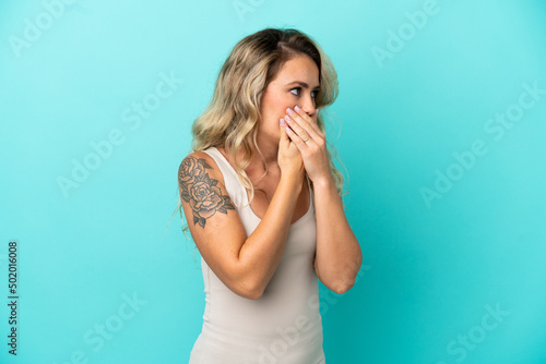 Young Brazilian woman isolated on blue background covering mouth and looking to the side