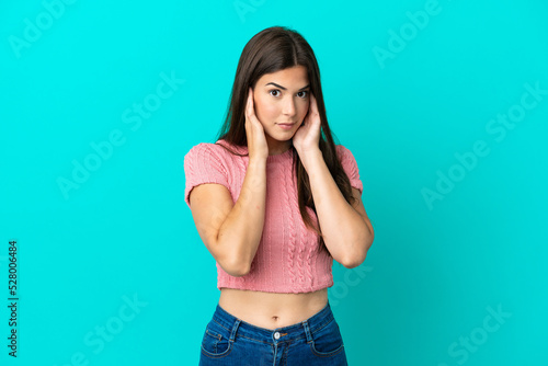 Young Brazilian woman isolated on blue background frustrated and covering ears