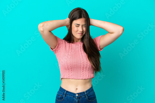 Young Brazilian woman isolated on blue background frustrated and covering ears