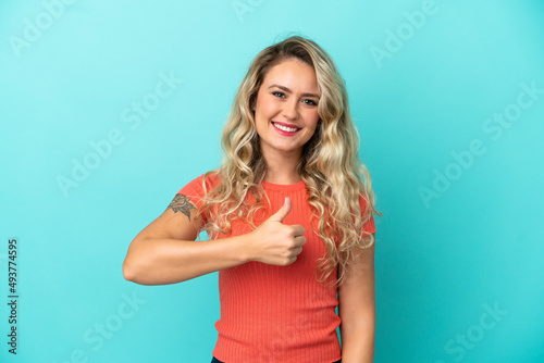 Young Brazilian woman isolated on blue background giving a thumbs up gesture