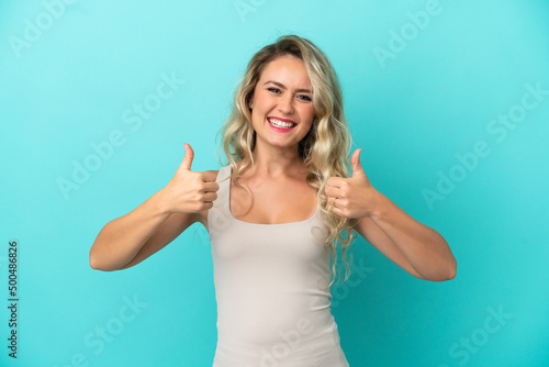 Young Brazilian woman isolated on blue background giving a thumbs up gesture