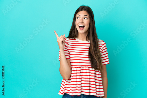 Young Brazilian woman isolated on blue background intending to realizes the solution while lifting a finger up