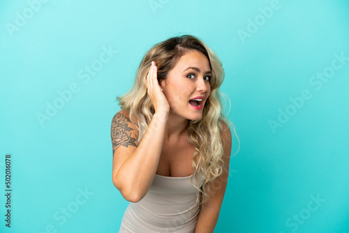 Young Brazilian woman isolated on blue background listening to something by putting hand on the ear