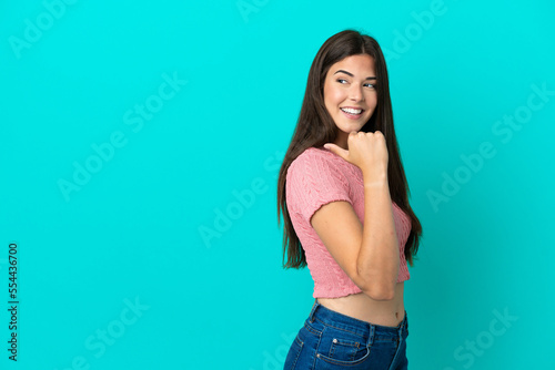 Young Brazilian woman isolated on blue background pointing to the side to present a product