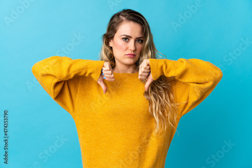 Young Brazilian woman isolated on blue background showing thumb down with two hands