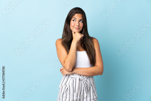 Young brazilian woman isolated on blue background thinking an idea while looking up