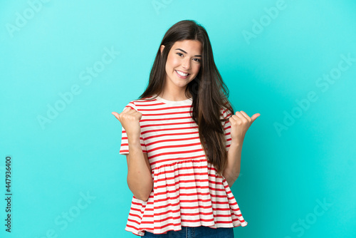 Young Brazilian woman isolated on blue background with thumbs up gesture and smiling
