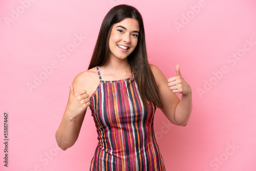 Young Brazilian woman isolated on pink background giving a thumbs up gesture