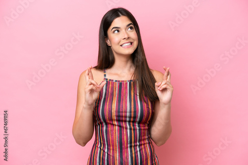 Young Brazilian woman isolated on pink background with fingers crossing and wishing the best