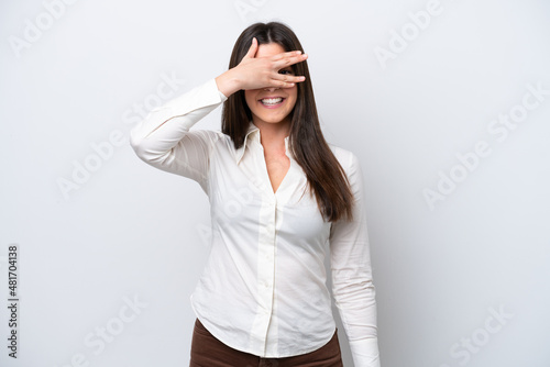 Young Brazilian woman isolated on white background covering eyes by hands and smiling