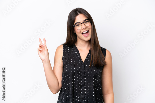 Young Brazilian woman isolated on white background smiling and showing victory sign
