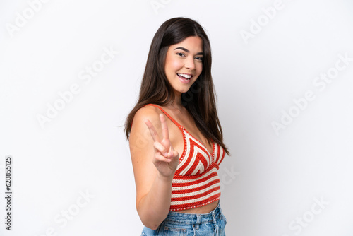 Young Brazilian woman isolated on white background smiling and showing victory sign