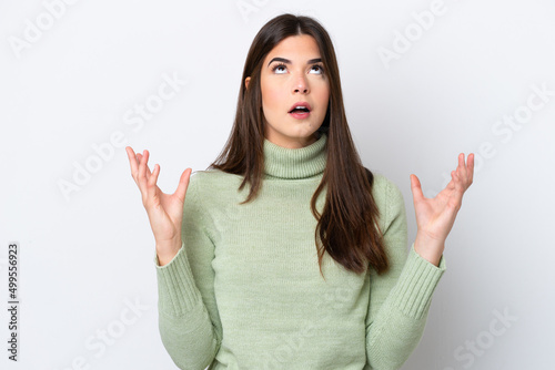 Young Brazilian woman isolated on white background stressed overwhelmed
