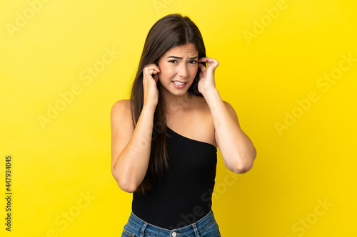 Young Brazilian woman isolated on yellow background frustrated and covering ears