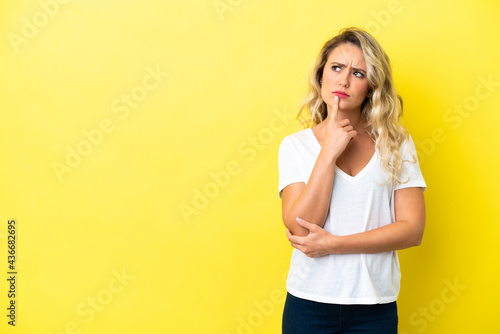 Young Brazilian woman isolated on yellow background having doubts while looking up