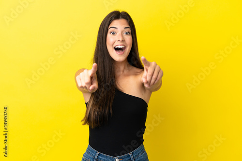 Young Brazilian woman isolated on yellow background surprised and pointing front