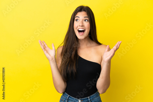 Young Brazilian woman isolated on yellow background with surprise facial expression