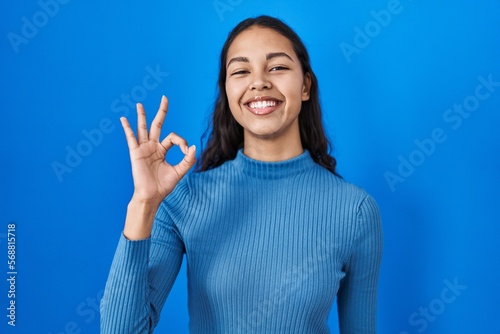Young brazilian woman standing over blue isolated background smiling positive doing ok sign with hand and fingers. successful expression.