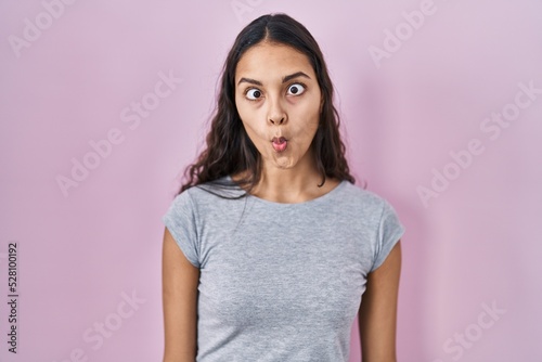 Young brazilian woman wearing casual t shirt over pink background making fish face with lips, crazy and comical gesture. funny expression.