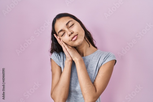 Young brazilian woman wearing casual t shirt over pink background sleeping tired dreaming and posing with hands together while smiling with closed eyes.